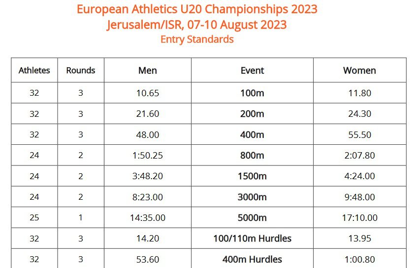 Η Ευρωπαϊκή Ομοσπονδία Στίβου ανακοίνωσε τα όρια για τις προϋποθέσεις συμμετοχής στο Ευρωπαϊκό Πρωτάθλημα Κ20 που θα γίνει στην Ιερουσαλήμ.